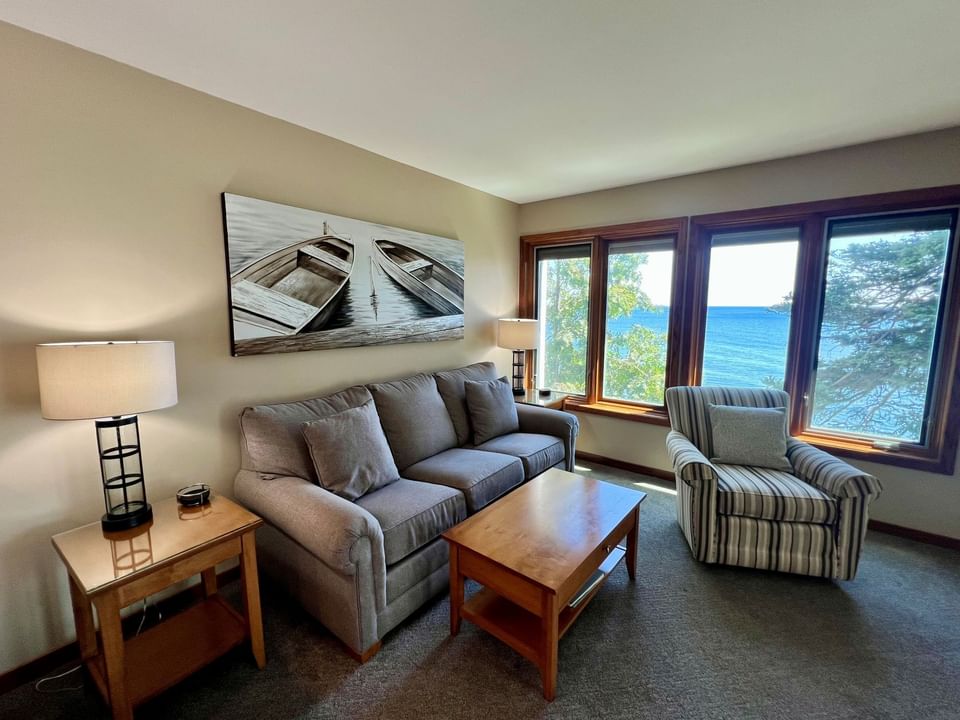 This two-story condo is our only one bedroom style with fantastic Lake Superior views from both the living room and the bedroom.